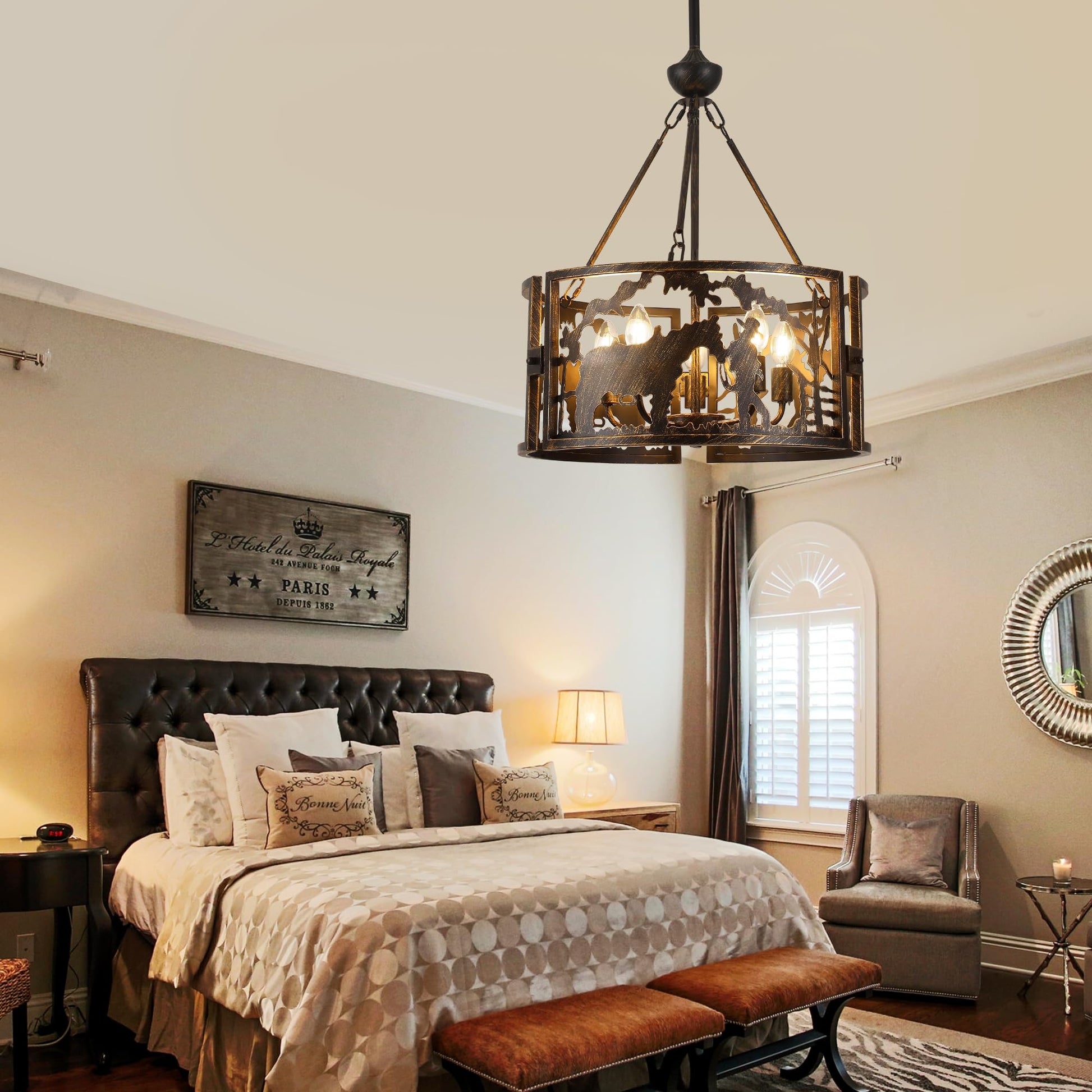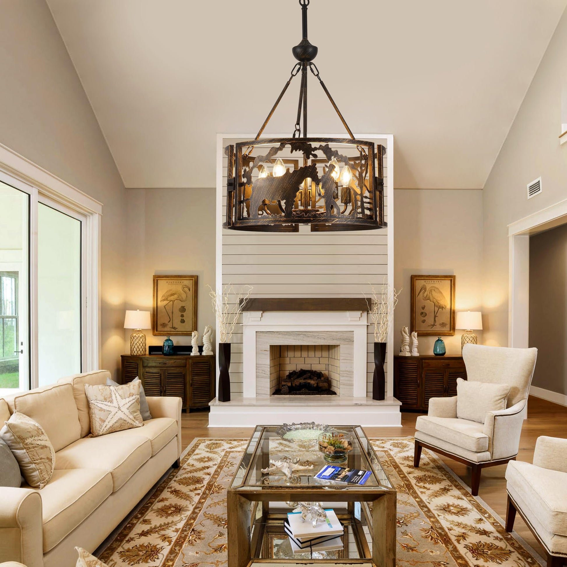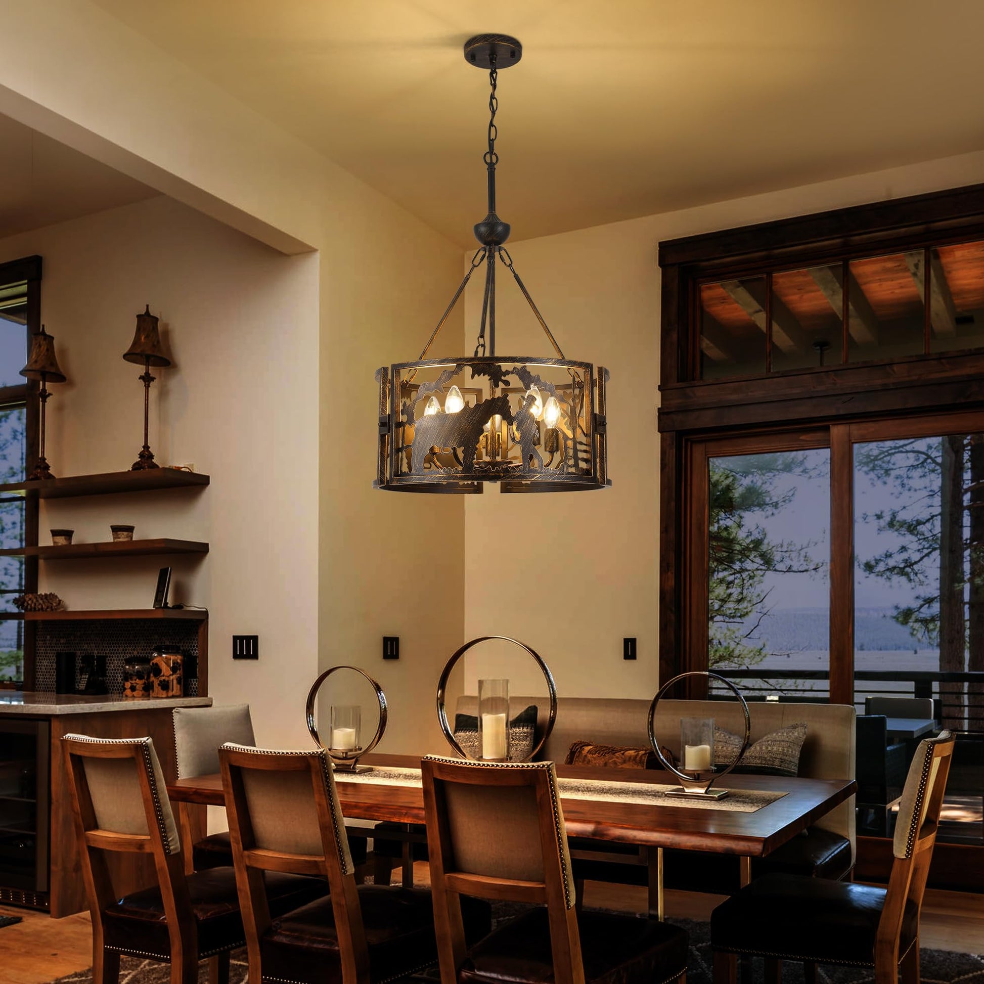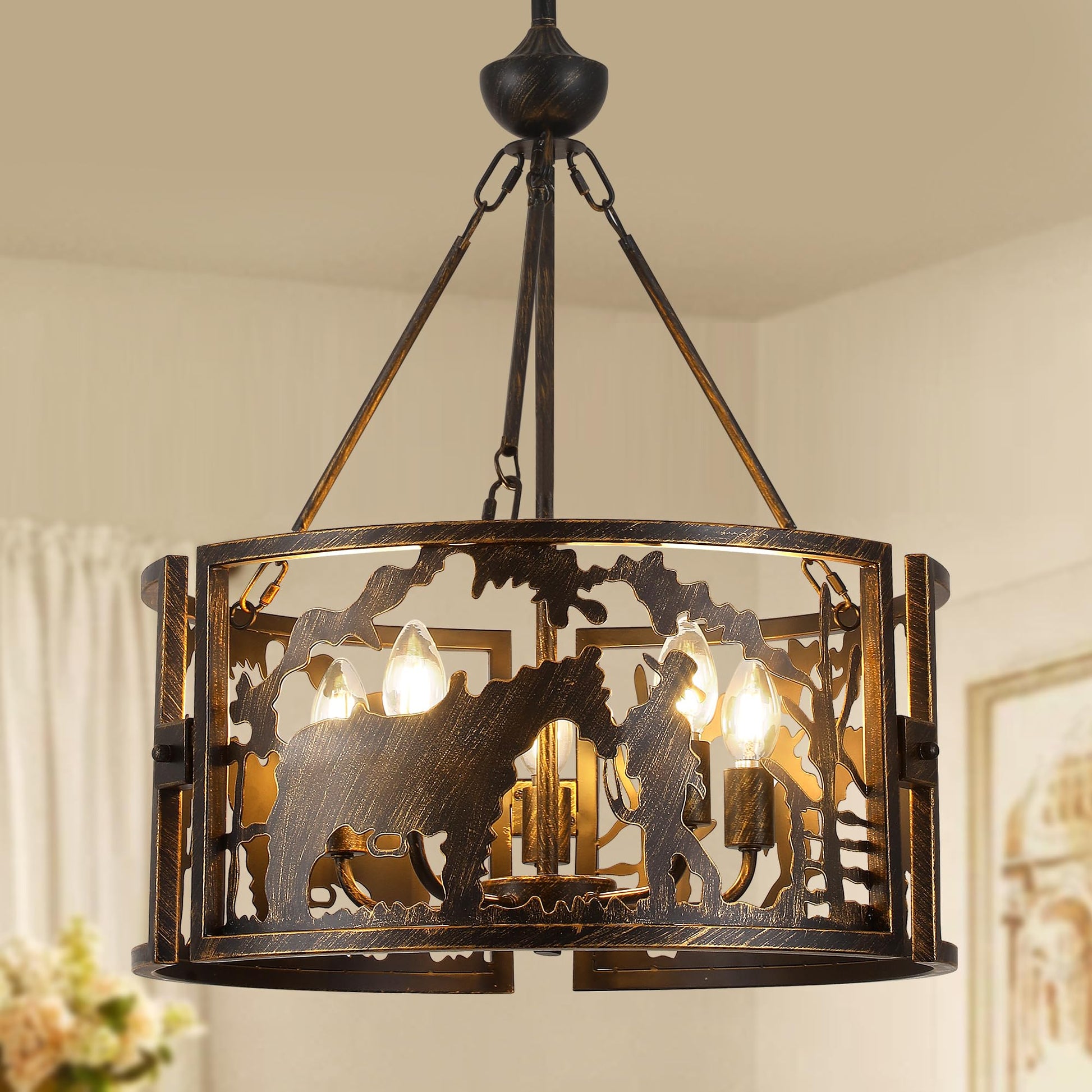 - Classic Design: Industrial drum chandelier is crafted by skilled artisans using quality metal. Metal construction and silhouette look of cowboys and steers add a unique lighting effect to this drum metal art fixture. Vintage gold texture paired with classic black blends well with farmhouse, rustic and industrial styles and enhances the ambiance of the space